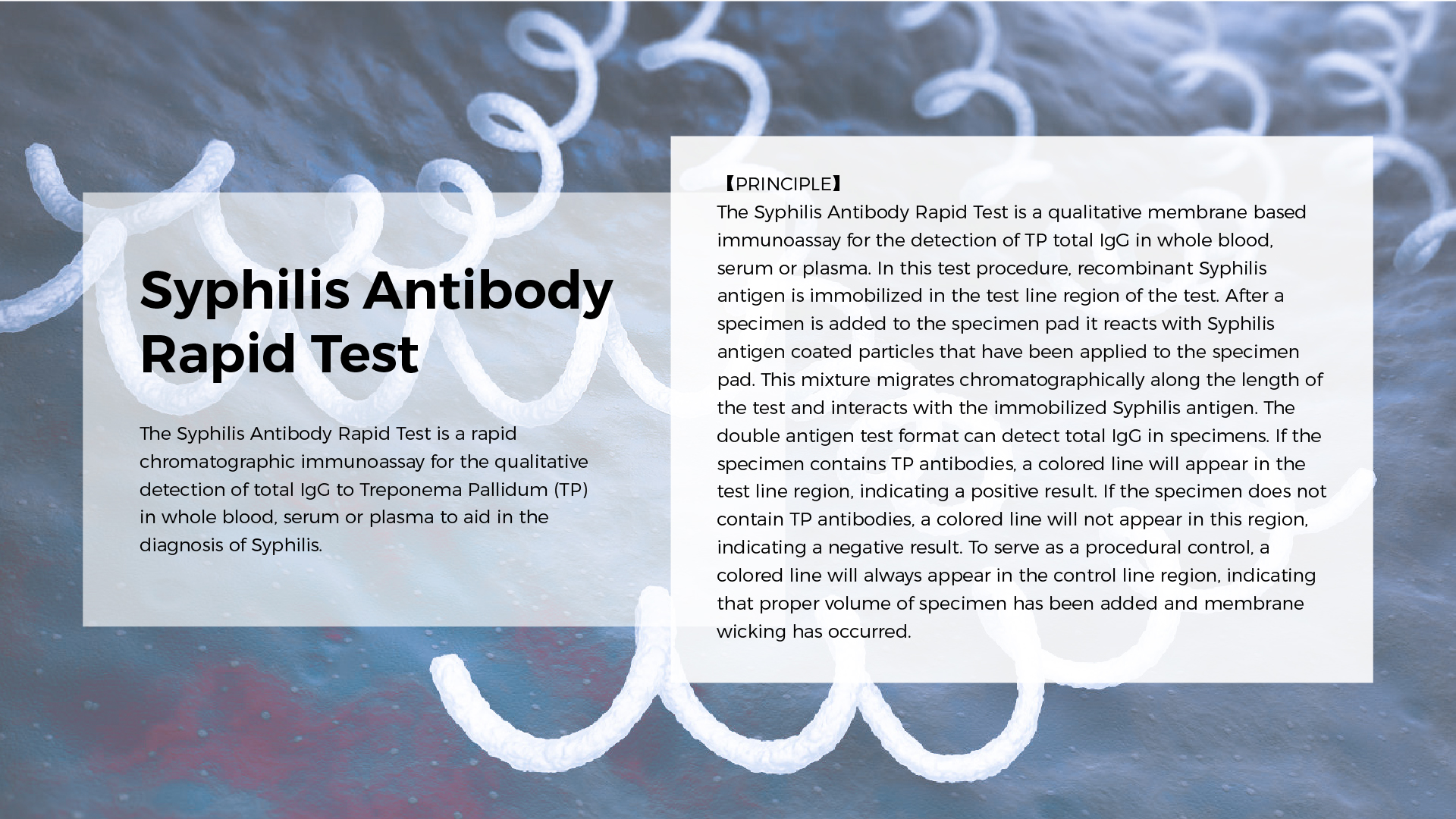 02 Specific antibody detection: Treponema pallidum antibody detection (RT), used for initial rapid screening. Treponema pallidum specific antibody detection (CLIA, chemiluminescence immunoassay) is used for screening and diagnosis.